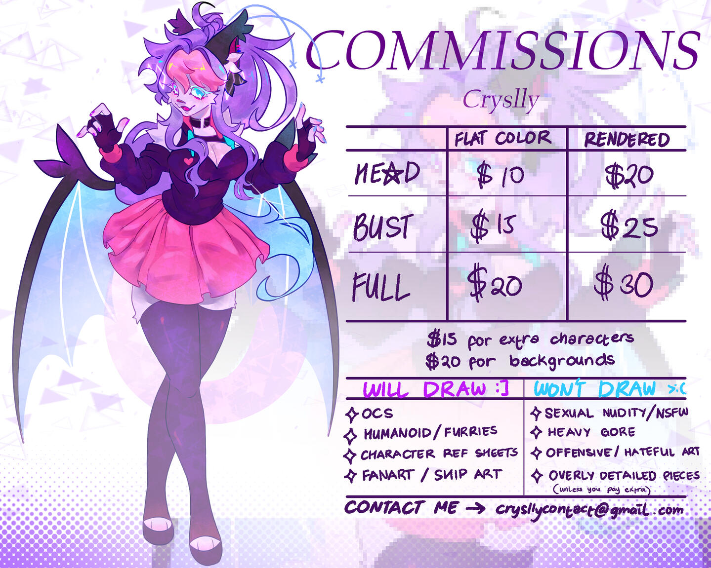 ✦COMMISSION INFO✦ (will be updated from time to time)✦ I use PayPal and I start commissions after the payment.✦ DEADLINES - please be patient with me finishing your piece as I take a long time to finish one because I still have responsibilities to do irl, so I won't be anxious and stressed. I can only take around a week to a month to finish.✦ I HAVE THE RIGHT TO DECLINE - please be understanding if I ever decline because if it's something I'm uncomfortable with or that is beyond my ability.✦ DO NOT CLAIM IT AS YOUR OWN - even if you bought the commission it doesn't mean you made it, silly.✦ FOR PERSONAL COMMISSIONS ONLY - I only do personal commissions. don't use my commissions to make money out of them.✦I DO NOT accept my works being used as NFTs✦I DO NOT accept any freebies, exposure as payment✦Sometimes I took a long time figuring out how to draw things that I haven't drawn before, but not to worry! I love challenging myself through with this and learning new ways of my art.✦Please do know the prices first before you commissioned me, do not complain about my prices being too high.✦I accept refunds, but please do not ask for them when I am almost finished with the work✦Prices will be added for more characters and for more complex backgrounds.Realistic backgrounds are 20 USD (price will cost more depends on the background. minimum is 20 USD)